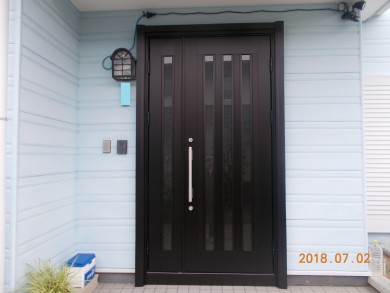 一日で工事が完了する、ドアリモを希望されたので、サイズを変える事はできませんでしたが、採光のみで取り付けてあった上部のランマ部を無くしたことで、開口部が広くなりました。