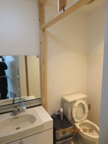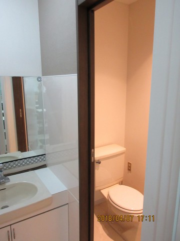手洗いとの間に壁を設置し有効スペースを活用するため引戸を選択、防音材で使用音も気にならなくなりました。